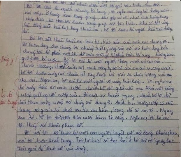 Tuy nhiên, đến phần chính học sinh này lại viết theo giọng truyện kiếm hiệp như sau: “Tôi nghe mẹ tôi kể hơn 20 năm trước chính bố đã giải cứu mẹ khỏi một bang cướp giết người cướp của. Bố mặc sự hiểm nguy chính mình đã lần theo bang cướp và dùng võ Kungfu đánh tan bang cướp có vũ trang và giải cứu đám con tin an toàn.